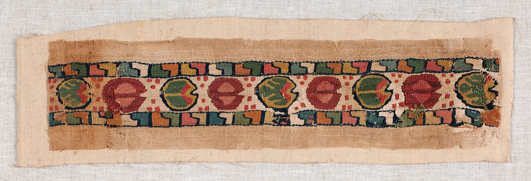 Un de ces deux médaillons fait aujourd'hui partie de leur collection, mais c'est chez un marchand parisien spécialisé dans les antiquités égyptiennes qu'ils ont acquis leur premier fragment copte. Il s'agit d'une encolure de tunique en tapisserie, une frise regroupant trois cavaliers, des personnages armés et des vases portant des capsules de lotus.